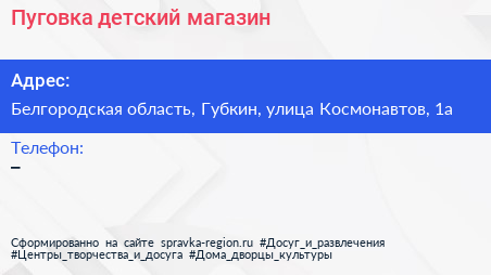 Пуговка, детский магазин по адресу Белгородская область, Губкин, улица Космонавтов, 1а в дальнейшем Организация, размещена в следующих категориях: