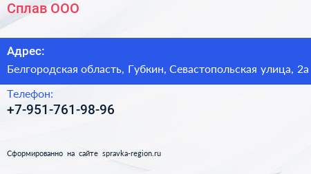 Сплав, ООО по адресу Белгородская область, Губкин, Севастопольская улица, 2а в дальнейшем Организация, размещена в следующих категориях: