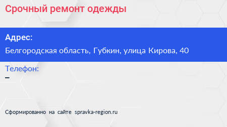 Срочный ремонт одежды по адресу Белгородская область, Губкин, улица Кирова, 40 в дальнейшем Организация, размещена в следующих категориях: