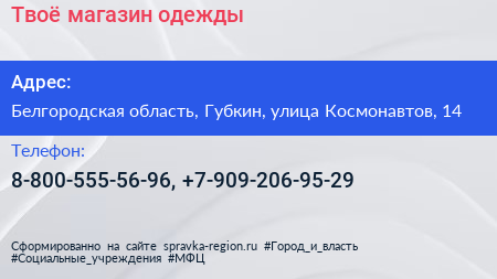 Твоё, магазин одежды по адресу Белгородская область, Губкин, улица Космонавтов, 14 в дальнейшем Организация, размещена в следующих категориях: