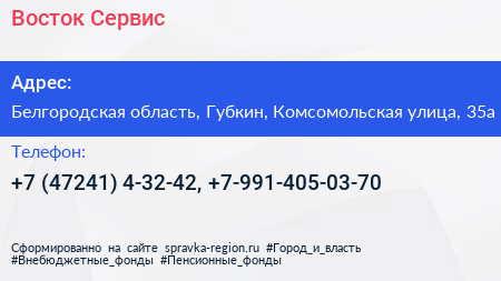 Восток-Сервис по адресу Белгородская область, Губкин, Комсомольская улица, 35а в дальнейшем Организация, размещена в следующих категориях: