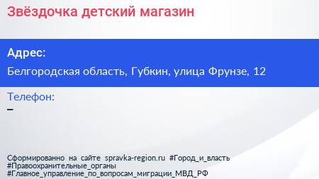 Звёздочка, детский магазин по адресу Белгородская область, Губкин, улица Фрунзе, 12 в дальнейшем Организация, размещена в следующих категориях: