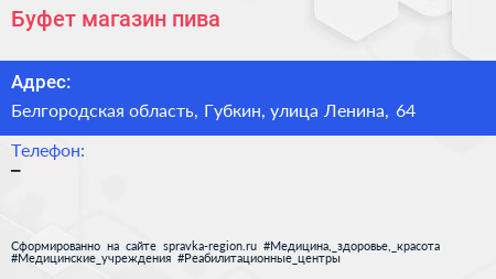 Буфет, магазин пива по адресу Белгородская область, Губкин, улица Ленина, 64 в дальнейшем Организация, размещена в следующих категориях: