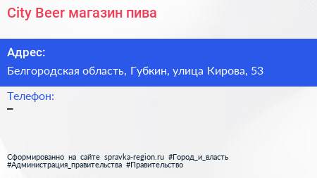 City Beer, магазин пива по адресу Белгородская область, Губкин, улица Кирова, 53 в дальнейшем Организация, размещена в следующих категориях: