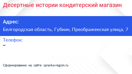 Десертные истории, кондитерский магазин по адресу Белгородская область, Губкин, Преображенская улица, 7 в дальнейшем Организация, размещена в следующих категориях: