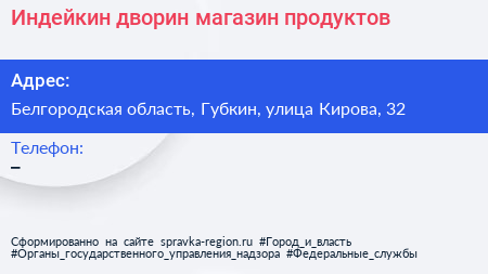 Индейкин дворин, магазин продуктов по адресу Белгородская область, Губкин, улица Кирова, 32 в дальнейшем Организация, размещена в следующих категориях: