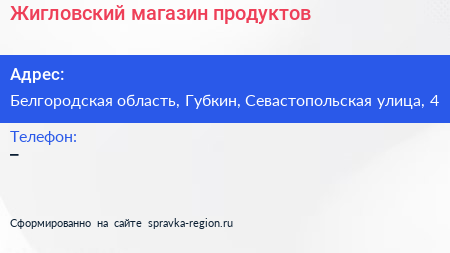 Жигловский, магазин продуктов по адресу Белгородская область, Губкин, Севастопольская улица, 4 в дальнейшем Организация, размещена в следующих категориях: