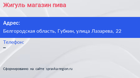Жигуль, магазин пива по адресу Белгородская область, Губкин, улица Лазарева, 22 в дальнейшем Организация, размещена в следующих категориях: