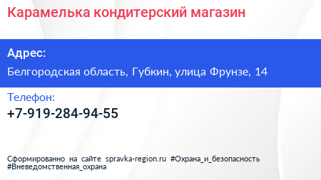 Карамелька, кондитерский магазин по адресу Белгородская область, Губкин, улица Фрунзе, 14 в дальнейшем Организация, размещена в следующих категориях: