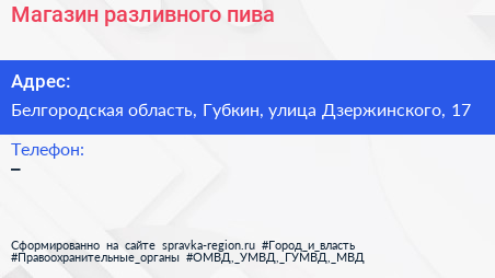 Магазин разливного пива по адресу Белгородская область, Губкин, улица Дзержинского, 17 в дальнейшем Организация, размещена в следующих категориях: