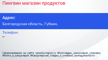 Пингвин, магазин продуктов по адресу Белгородская область, Губкин, в дальнейшем Организация, размещена в следующих категориях: