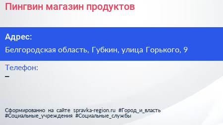Пингвин, магазин продуктов по адресу Белгородская область, Губкин, улица Горького, 9 в дальнейшем Организация, размещена в следующих категориях: