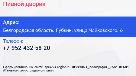Пивной дворик по адресу Белгородская область, Губкин, улица Чайковского, 6 в дальнейшем Организация, размещена в следующих категориях: