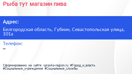 Рыба тут, магазин пива по адресу Белгородская область, Губкин, Севастопольская улица, 101а в дальнейшем Организация, размещена в следующих категориях: