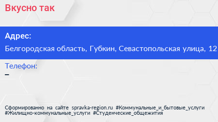 Вкусно так по адресу Белгородская область, Губкин, Севастопольская улица, 12 в дальнейшем Организация, размещена в следующих категориях: