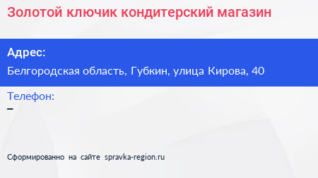 Золотой ключик, кондитерский магазин по адресу Белгородская область, Губкин, улица Кирова, 40 в дальнейшем Организация, размещена в следующих категориях: