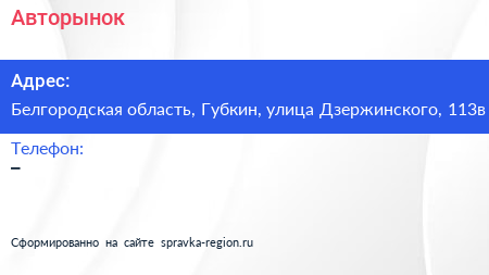 Авторынок по адресу Белгородская область, Губкин, улица Дзержинского, 113в в дальнейшем Организация, размещена в следующих категориях: