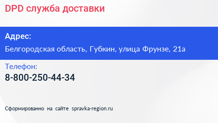 DPD, служба доставки по адресу Белгородская область, Губкин, улица Фрунзе, 21а в дальнейшем Организация, размещена в следующих категориях: