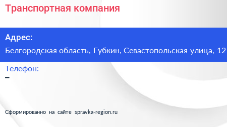 Транспортная компания по адресу Белгородская область, Губкин, Севастопольская улица, 12 в дальнейшем Организация, размещена в следующих категориях: