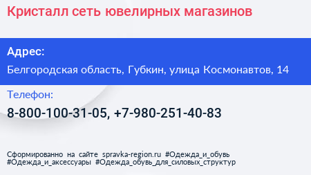 Кристалл, сеть ювелирных магазинов по адресу Белгородская область, Губкин, улица Космонавтов, 14 в дальнейшем Организация, размещена в следующих категориях: