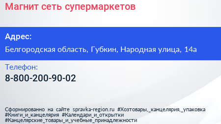 Магнит, сеть супермаркетов по адресу Белгородская область, Губкин, Народная улица, 14а в дальнейшем Организация, размещена в следующих категориях: