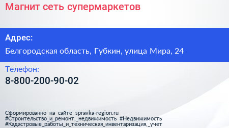 Магнит, сеть супермаркетов по адресу Белгородская область, Губкин, улица Мира, 24 в дальнейшем Организация, размещена в следующих категориях: