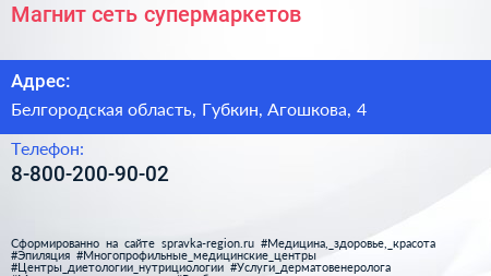 Магнит, сеть супермаркетов по адресу Белгородская область, Губкин, Агошкова, 4 в дальнейшем Организация, размещена в следующих категориях:
