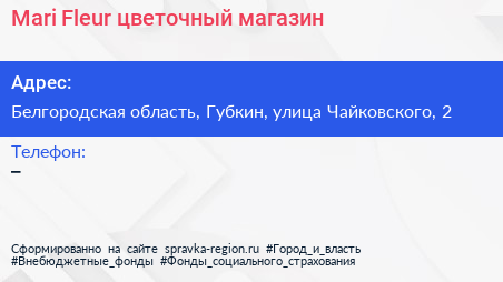 Mari Fleur, цветочный магазин по адресу Белгородская область, Губкин, улица Чайковского, 2 в дальнейшем Организация, размещена в следующих категориях: