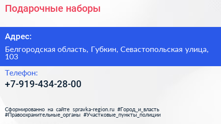 Подарочные наборы по адресу Белгородская область, Губкин, Севастопольская улица, 103 в дальнейшем Организация, размещена в следующих категориях: