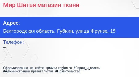 Мир Шитья, магазин ткани по адресу Белгородская область, Губкин, улица Фрунзе, 15 в дальнейшем Организация, размещена в следующих категориях: