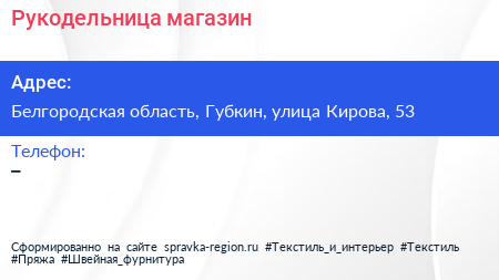 Рукодельница, магазин по адресу Белгородская область, Губкин, улица Кирова, 53 в дальнейшем Организация, размещена в следующих категориях: