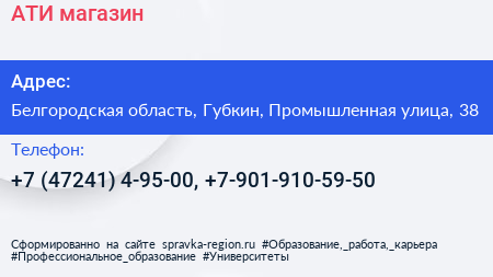 АТИ, магазин по адресу Белгородская область, Губкин, Промышленная улица, 38 в дальнейшем Организация, размещена в следующих категориях: