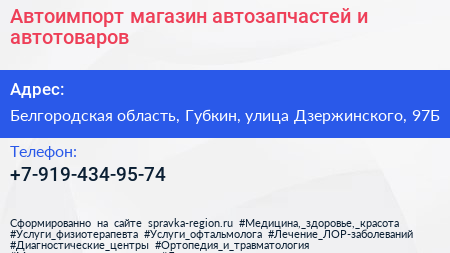 Автоимпорт, магазин автозапчастей и автотоваров по адресу Белгородская область, Губкин, улица Дзержинского, 97Б в дальнейшем Организация, размещена в следующих категориях: