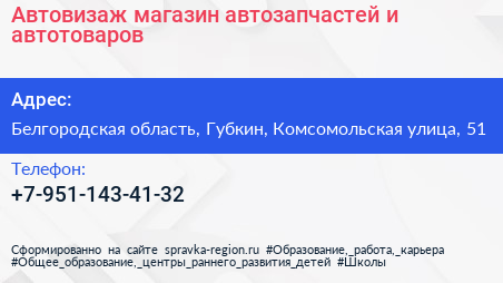 Автовизаж, магазин автозапчастей и автотоваров по адресу Белгородская область, Губкин, Комсомольская улица, 51 в дальнейшем Организация, размещена в следующих категориях: