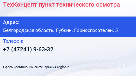 ТехКонцепт, пункт технического осмотра по адресу Белгородская область, Губкин, Горноспасателей, 5 в дальнейшем Организация, размещена в следующих категориях:
