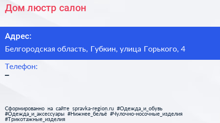 Дом люстр, салон по адресу Белгородская область, Губкин, улица Горького, 4 в дальнейшем Организация, размещена в следующих категориях: