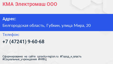 КМА Электромаш, ООО по адресу Белгородская область, Губкин, улица Мира, 20 в дальнейшем Организация, размещена в следующих категориях: