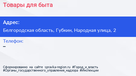 Товары для быта по адресу Белгородская область, Губкин, Народная улица, 2 в дальнейшем Организация, размещена в следующих категориях: