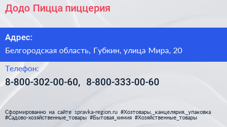 Додо Пицца, пиццерия по адресу Белгородская область, Губкин, улица Мира, 20 в дальнейшем Организация, размещена в следующих категориях:
