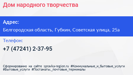 Дом народного творчества по адресу Белгородская область, Губкин, Советская улица, 25а в дальнейшем Организация, размещена в следующих категориях: