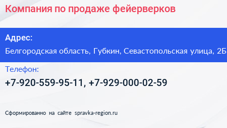 Компания по продаже фейерверков по адресу Белгородская область, Губкин, Севастопольская улица, 2Б в дальнейшем Организация, размещена в следующих категориях: