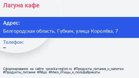 Лагуна, кафе по адресу Белгородская область, Губкин, улица Королёва, 7 в дальнейшем Организация, размещена в следующих категориях: