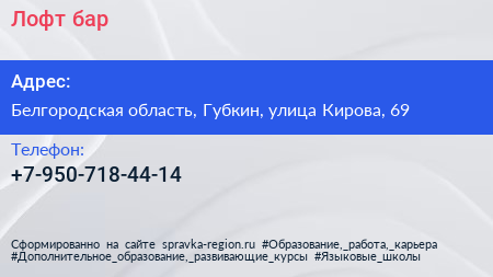 Лофт-бар по адресу Белгородская область, Губкин, улица Кирова, 69 в дальнейшем Организация, размещена в следующих категориях:
