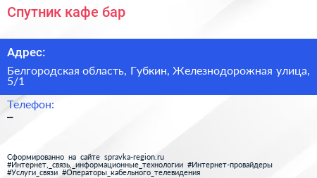 Спутник, кафе-бар по адресу Белгородская область, Губкин, Железнодорожная улица, 5/1 в дальнейшем Организация, размещена в следующих категориях: