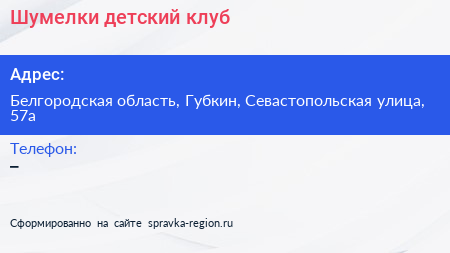 Шумелки, детский клуб по адресу Белгородская область, Губкин, Севастопольская улица, 57а в дальнейшем Организация, размещена в следующих категориях: