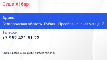 Суши Xl, бар по адресу Белгородская область, Губкин, Преображенская улица, 7 в дальнейшем Организация, размещена в следующих категориях: