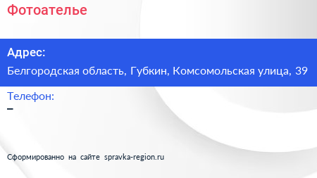 Фотоателье по адресу Белгородская область, Губкин, Комсомольская улица, 39 в дальнейшем Организация, размещена в следующих категориях: