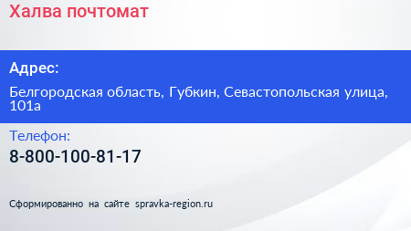 Халва, почтомат по адресу Белгородская область, Губкин, Севастопольская улица, 101а в дальнейшем Организация, размещена в следующих категориях: