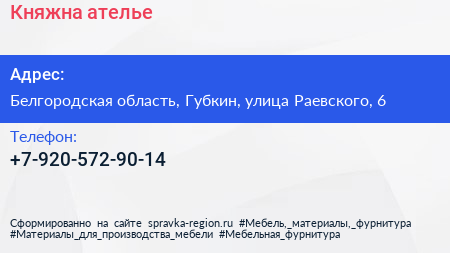 Княжна, ателье по адресу Белгородская область, Губкин, улица Раевского, 6 в дальнейшем Организация, размещена в следующих категориях: