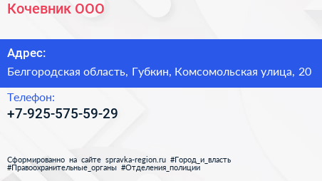 Кочевник, ООО по адресу Белгородская область, Губкин, Комсомольская улица, 20 в дальнейшем Организация, размещена в следующих категориях: